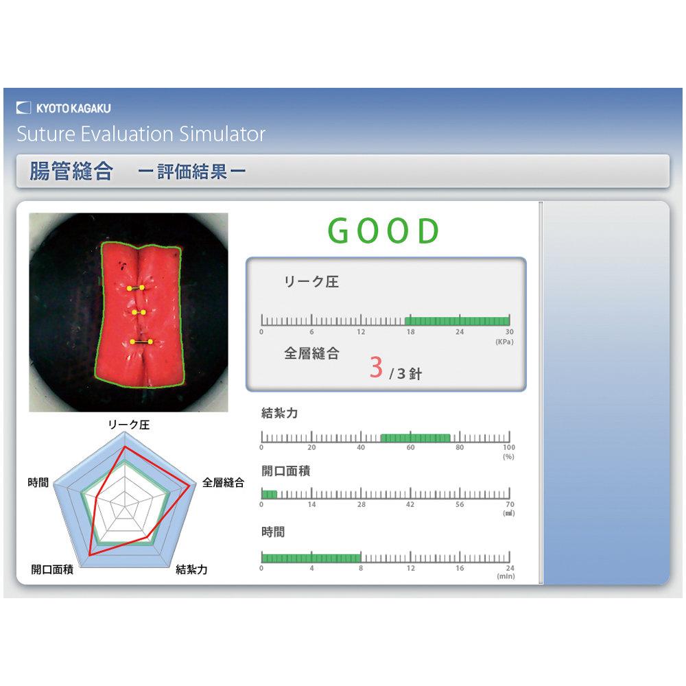 | 特長 | ○腹腔鏡下の縫合を実習でき、成功不成功を客観的に数値で評価。 ○評価は統計的根拠に基づいた世界初の評価基準を採用。 ○新開発の腸管シートは、生体に近い縫合感を再現。 ○手技結果データを継続的に保存できる記録機能。 |
