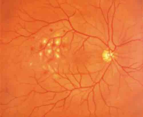 Retinal Vein Occlusion (post retinal laser photocoagulation) (right): The scar from retinal laser photocoagulation treatment can be seen as a series of whitish spots. After bleeding, the retinal veins form white lines.